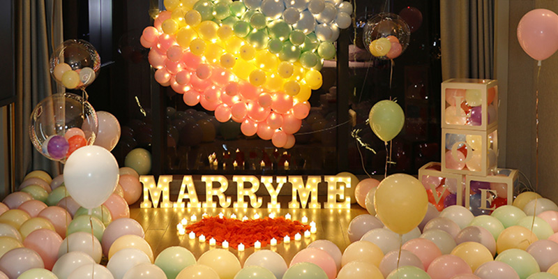 當你選定好在飯店求婚, 首先要考量到房間大小與格局,都會影響到佈置的效果唷~ ✦ 氣球類 一般氣球: 充普通空氣的氣球,不會飄。 最常見的佈置是放在地上,像在泡泡海裡效果就很可愛。 也可以做成氣球拱門、愛心氣球、月亮氣球、氣球牆 ... 非常多樣化。 如果想營造空飄效果,也沒問題!! 加上氣球柱,製造仿空飄效果也很好看!還不用擔心空飄的時效性。 推薦給想要空飄效果,但無法當天取件的你。 空飄氣球: 使用安全的氣體『 氦氣 』,不管是直接空飄到天花板,或是綁重物讓氣球落地,都能創造不同的視覺效果~ 一般圓圓的乳膠氣球約可維持3~5小時,金屬光澤的鋁箔氣球可以維持約5天左右的空飄時效性。